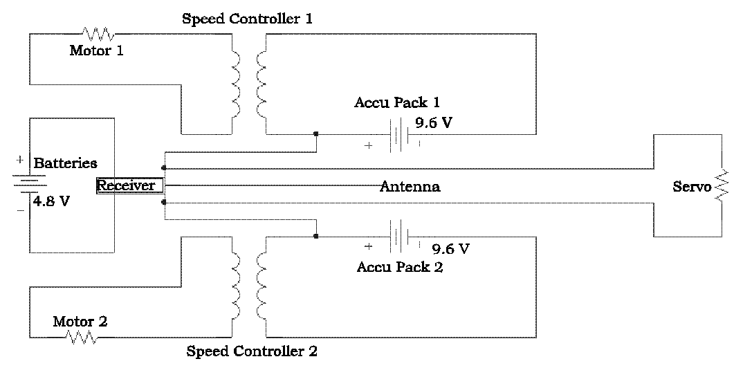 a servo, two motors, two speed controllers, a receiver, and 16 accumulators